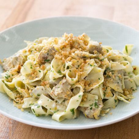 Jarred artichoke hearts and tagliatelle make a quick and elegant dinner. We slice the leaves from jarred artichoke hearts and then give them a quick soak to temper the harsh flavors they pick up from the brine. We cut the hearts in half and then dry them well so that they can be easily browned to bring out their natural nuttiness. Anchovies give the sauce savory depth, and cream ties together the aromatics, wine, and artichoke flavor. A simple Parmesan bread-crumb topping gives the dish some savory crunch.