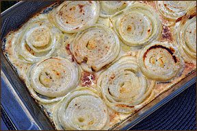 4. Spoon about a tablespoon of the cream mixture over each onion slice. Cover with aluminum foil, return to the oven, and cook for about 25 minutes. Increase the oven temperature to 450°F.