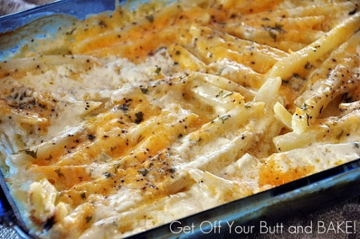 Pour all of the cream over the top of the fries. Salt and pepper them generously. Sprinkle at least 2 cups grated Cheddar Cheese over the top. Sprinkle Parsley flakes on top of the cheese. Cover with foil, and poke a fork through the top of the foil, 2 or 3 times to allow a little steam to escape. This way, your cream doesn’t boil over into your oven!