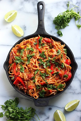 1. In a VERY large pot (preferably heavy bottomed) combine linguini, tomatoes, stock, hot sauce, onion, garlic, red and green peppers, red-pepper flakes, cilantro, oil, salt, cumin, chili powder, oregano, pepper, and water. Bring to a boil over high heat.