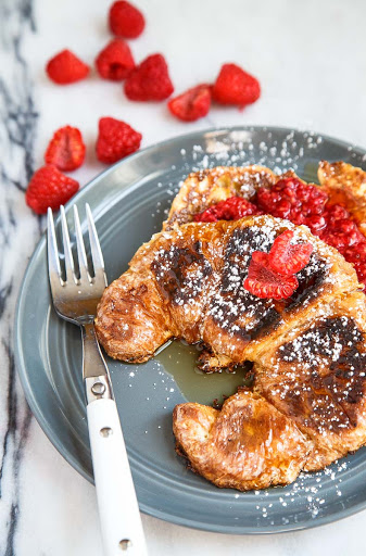 When the croissants come out of the skillet, spread half of the raspberry mixture on the bottom pieces. Top with the croissant tops.