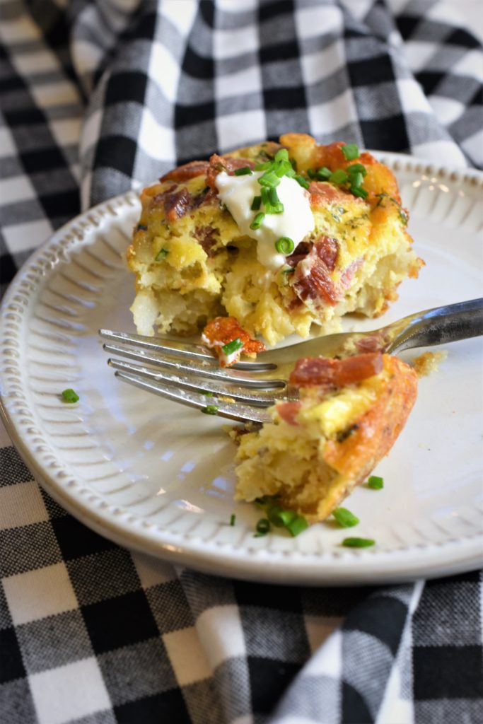 Let rest for 5 minutes, with a knife, score around each casserole to make sure it’s loose and transfer to serving platter and garnish with a small dollop of sour cream & chives