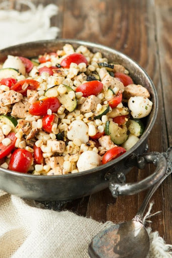 Chop the chicken and toss in a large bowl the remaining marinade from the vegetables, the tomatoes, mozzarella and grilled veggies. Season with additional salt and pepper as needed and enjoy!