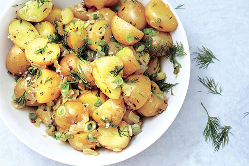Cover 2 pounds halved small waxy potatoes with cold salted water, bring to a boil, and cook until tender; drain and transfer to a large bowl. Meanwhile, heat 1/4 cup olive oil in a medium skillet over medium-high heat. Add 1/2 chopped onion; season with salt and pepper. Cook, stirring often, until soft, about 5 minutes. Remove from heat and mix in 1/4 cup apple cider vinegar. Add to potatoes along with 4 sliced scallions, 2 tablespoons chopped fresh dill, and 1 teaspoon toasted caraway seeds and toss, crushing potatoes slightly; season with salt and pepper.