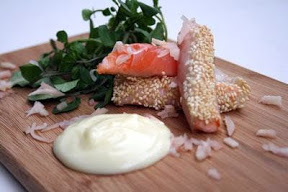 Fry the salmon rolls sesame seeds down for about 60 seconds, or until the seeds are just starting to brown. Remove from the heat and serve straight away with a dollop of mayonnaise, a sprinkling of the pickled ginger.
