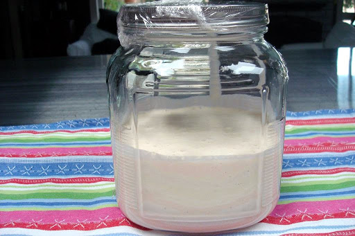 Note: Starter can be stored for several weeks. If it is not used regularly every week, add 1 teaspoon sugar and stir well. If used regularly, starter will be active indefinitely. Makes about 4 cups starter.