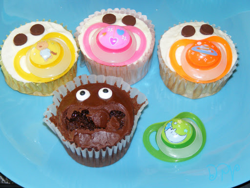 Decorate tops with upside down chocolate chips for eyes (or candy eyes) and pacifiers. (I removed the nipples from these).