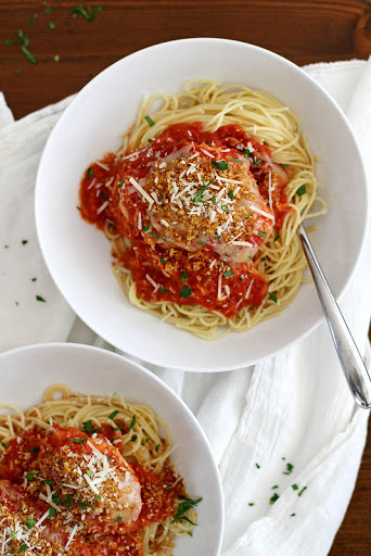 When chicken is cooked through, sprinkle remaining mozzarella cheese over top. Serve in bowls over pasta, if desired, topping chicken with breadcrumbs and remaining Parmesan cheese. Garnish with parsley, if desired.