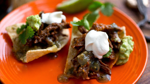 Heat broiler. Spread tortilla chips on a rimmed baking sheet. Top evenly with meat and sauce. Sprinkle cheese over the top. Broil until hot and cheese is melted, 1 to 2 minutes.