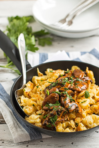 Serve on top of the Spätzle and garnish with chopped parsley.