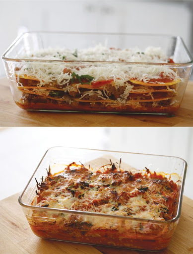 Using a 9×9 oven safe baking dish, put down enough sauce to lightly cover the bottom of the dish. (This keeps the squash from sticking to the pan.) Next add the squash, trying not to overlap the pieces, then spoon on the sausage mixture, followed by the sauce. Repeat until all your ingredients are used up…trying to reserve enough sauce to cover the top of the lasagna.