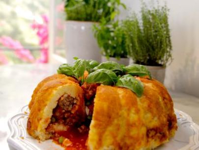 Place a plate large enough to cover the top of the pan over the pan. Using heat-resistant pads or a towel, invert the sartu onto the plate. Carefully lift the pan off of the rice, shaking gently if needed. Warm the remaining sauce and fill the opening in the middle of the molded rice with the sauce to serve.