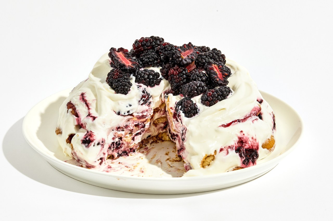 Measure out 2 cups blackberries from 2 pints. Slice berries in half lengthwise and transfer to a medium bowl. (Save remaining berries for decorating later.)Add ½ cup blackberry jam to bowl with berries. Using a citrus juicer, juice 1 lemon over berry mixture. Let sit 10 minutes.Using an electric mixer, beat 2 cups heavy cream in a large bowl, starting on low speed and increasing to high, until soft peaks form.EVERYTHING YOU EVER WANTED TO KNOW ABOUT WHIPPED CREAM.Beat in ¼ cup powdered sugar and a pinch of salt just to combine.Line a medium bowl (6-cup capacity) with plastic wrap, pressing into bottom and up sides and leaving plenty of overhang. Line the bottom of bowl with a layer of vanilla wafers.Spoon about ¼ cup berry mixture over wafers. Scoop 1½ cups whipped cream into a small bowl; cover and save in fridge for later. Spread ½ cup of the remaining whipped cream evenly over wafer and berry layers. Repeat layers with wafers (breaking to fit as needed—no one will know), blackberry mixture, and whipped cream, using more for each layer as the bowl gets wider, until you run out of all the components.Bring up plastic overhang to cover and chill at least 24 hours.Unwrap plastic from top of cake and place a large cake stand or platter firmly over it. Flip over and lift bowl away; peel away plastic wrap. (Ta-da!)Using a whisk, beat reserved whipped cream back to soft peaks, then use a spoon to dollop cream all over cake and spread around evenly.Cut reserved berries in half lengthwise and arrange them on top.Slice cake into 8 pieces to serve.Do Ahead: Cake can be assembled 2 days ahead and can also be unmolded and covered in cream 1 hour ahead; either way, keep in the fridge until the last minute.