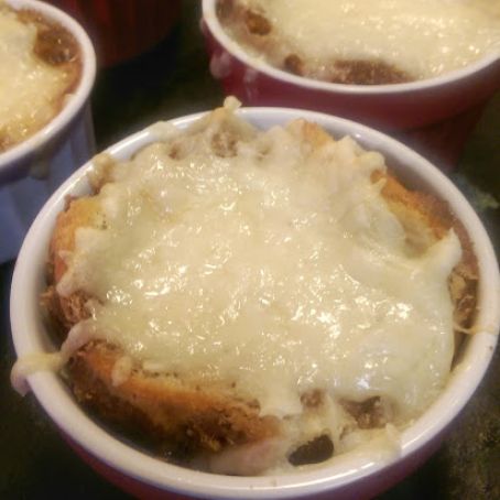 13. ladle soup into crocks leaving one inch to the lip. Place bread round, toasted side down, on top of soup and top with grated cheese. Broil until cheese is bubbly and golden, 1 to 2 minutes.