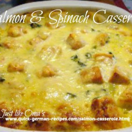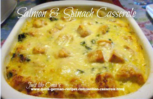 Layer potatoes in casserole. Spoon a bit of sauce over potatoes. Cover with spinach. Evenly spread salmon pieces over top.