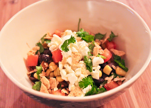 4: Once the bean mixture is done, start assembling your bowl! Put 1/4 cup cooked brown rice in a bowl. Top with 1/4 of the black bean mixture, add your toppings: 2 Tbsp cottage cheese, 2 Tbsp corn, diced tomato, cilantro, salsa, and 3-4 corn chips crumbled on top.