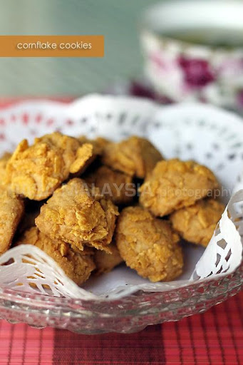 Beat butter and sugar till pale and creamy. Add vanilla essence. Stir in the lightly beaten eggs. Fold in the flour mixture including corn flour. (Mixture must not stick to our hands when touched.) Using an ice cream scoop, scoop out about 1 teaspoon of the cookie dough and roll it into the crushed cornflakes. Transfer them to a baking tray lined with parchment paper and bake for 25 minutes at 350 degree F or till golden brown.