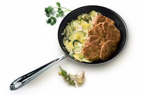 Sauté pork for 2-3 minutes per side; remove and keep warm. Add onion, garlic and zucchini or squash to skillet and sauté 5 minutes or until tender.