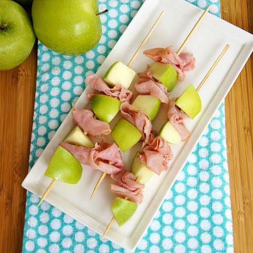 2. Alternating between the two, skewer an apple cube followed by a bunched up slice of ham. Repeat for desired amount of skewers.