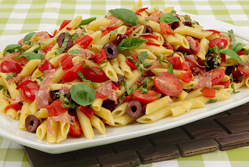 Add salami, olives, tomatoes and red pepper; toss to combine. (Make-ahead: Cover and refrigerate for up to 24 hours.) Add basil; toss again.