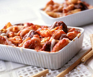 Arrange meatballs in bottom of prepared baking dish. Top with pasta, sauce, and mozzarella.