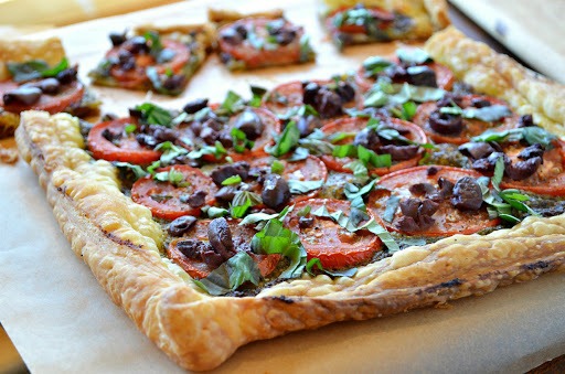 Spread the pesto evenly over the pastry (avoiding the rim), using a pastry brush or the back of a spoon. Arrange the tomato slices in a single layer over the entire square, within the rim. Season the tomatoes lightly with salt and pepper, and sprinkle the chopped olives over them.
