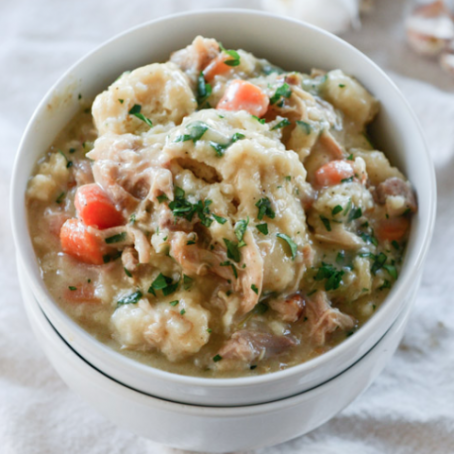 Top the entire pot with fresh chopped parsley. This is a very dumpling heavy recipe, which I adore. Serve immediately! I love how this reheats - just add a bit of stock or milk when reheating!