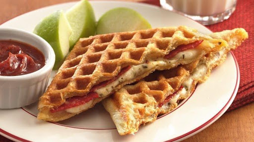 Bake 2 to 3 minutes or until sandwich is golden brown. With pancake turner, remove from waffle maker; place on cutting board. Cool 30 seconds before cutting. Cut into 4 square sandwiches or 8 triangular snacks. Repeat with remaining dough, cheese mixture and pepperoni. Serve warm with pizza sauce for dipping.