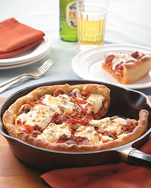 Combine sausage mixture, mushrooms, 1 cup mozzarella, tomatoes, basil, and pepperoni. Line prebaked crust with ham, add filling, and top with remaining mozzarella. Bake pizza until crust is brown and cheese melts, 30–35 minutes.