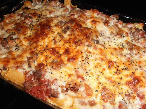 In a large skillet, over med. high heat add the olive oil and onions and sauté till tender (about 5 minutes), add in the ground beef and sausage and cook until browned and cooked through. Drain the grease, leaving a little in the pan for moisture. Add in the garlic, canned tomatoes with juice and the tomato sauce. Stir well, add in 2 tsp. Italian seasoning, pinch of salt and pepper and red pepper flakes. Once combined, remove 1 C. to a bowl and set aside to cool. Cover remaining sauce and simmer on low for 20 minutes. While the meat sauce is simmering, bring a large pot of water to a boil and cook the pasta with 1 T. of salt till tender. In another bowl, combine ricotta cheese, 1 beaten egg, 1 C. of mozzarella cheese, 1 tsp. italian seasoning and the parmesan cheese. When pasta is done, drain and add to the ricotta mixture stir to combine and then add the cooled sauce to the pasta and combine. In a 10x13 deep sided dish, lightly grease with cooking spray. Layer 1/2 of the noodle mixture in the bottom, top with 1/2 of the meat mixture then 1/2 of the cheese. Repeat for the final layer and sprinkle with dried basil on top of the cheese. Bake at 350 degrees for 45 minutes or until cheese is browning and casserole is bubbly.