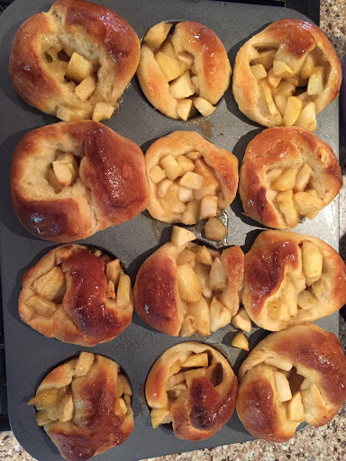 5. While the dough is rising, melt butter and brown sugar in a heavy pan over medium heat. Add apples and cook, stirring occasionally until apples are softened. I added cinnamon to taste. You can also add honey. Allow apples to cool completely.