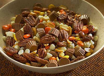 Stir together 1/2 cup glazed nuts, white chips, mini peanut butter cups, peanuts and candies. Store in cool, dry place. About 2 cups snack mix.