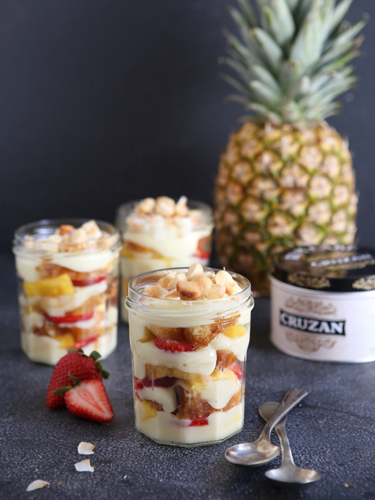 To assemble: Use a serrated knife to slice each cake in half across the middle. Place a cake half in the bottom of each 8-ounce mason jar. Spoon over 2 tablespoons of the tres leches mixture and 2 tablespoons crushed pineapple. Put the other half of each cake on top, and spoon over 2 to 3 more tablespoons of the tres leches mixture. Top each cake with lots of whipped cream and toasted coconut.