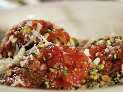 Remove the meatballs and place in a serving bowl. Top the meatballs with the marinara and garnish with the Parmesan, chopped pistachios and lime zest.