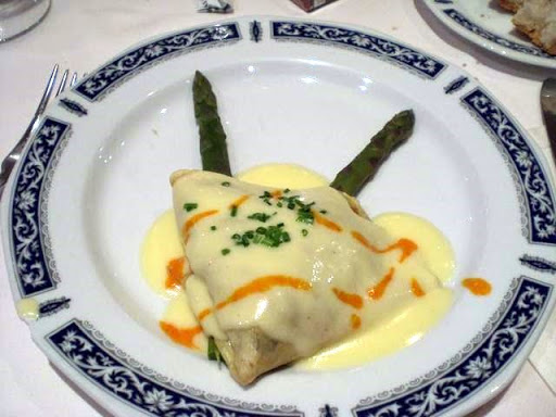 Adornar con salsa de pimiento, espárragos y perejil picado