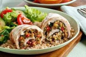 PLACE 2 chicken breasts in large freezer-weight resealable plastic bag. Pound with meat mallet or side of heavy can until chicken is 1/4 inch thick. Remove from bag; place, top-sides down, on cutting board. Repeat with remaining chicken. Spread chicken with stuffing mixture. Starting at 1 narrow end, tightly roll up each breast. Place, seam-sides down, in 13x9-inch baking dish. Drizzle with dressing.