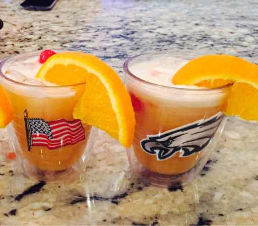 Shake all ingredients in cocktail shaker, add ice & shake again. Strain into glass. Garnish with a slice of orange & a cherry. Cheers!