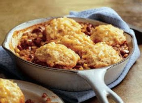 In medium bowl, stir Bisquick mix, remaining 1 teaspoon chili powder and the water until soft dough forms. Drop dough by 6 spoonfuls onto simmering beef mixture.