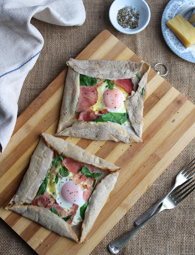 Use a ladle to pour in the batter – around 90mls at a time, lift the pan off the heat and swirl around the pan, using a spoon to help spread if necessary. Place the pan back on the heat, and when the top is no longer looking wet and runny scatter over the cheese, then crack an egg in the middle of the pan. Finally drape in the ham and spinach. Place a lid on the pan to keep the heat in to cook the egg, and sufficiently melt the cheese. Fold over the 4 edges into the galette. I then I like to transfer the pan under the grill to make sure the filings are cooked through.