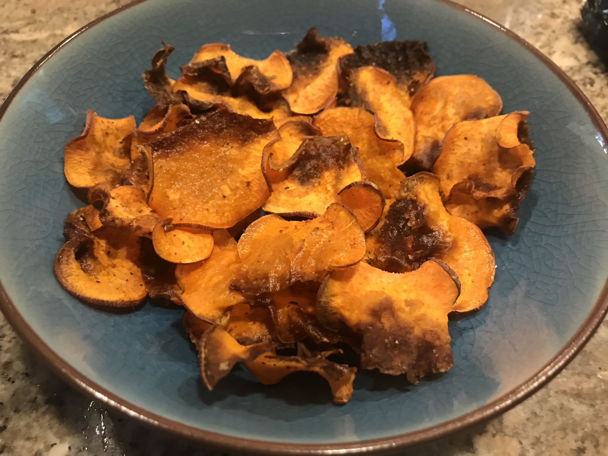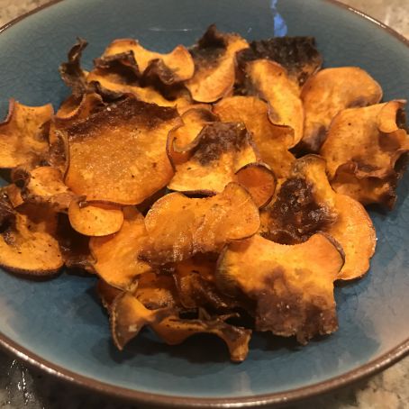 Scrub sweet potatoes. Cut using mandoline on the thinest setting. Lay potato slices on baking sheet covered in parchment paper. Spray with olive oil. Flip over. Spray again. Sprinkle with salt and/or garlic garni or garlic salt.