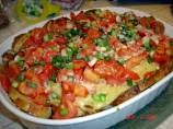 4. Reduce oven temperature to 350°F. Add pasta to sauce mixture; toss to mix thoroughly. Spoon into baked crust. Sprinkle with tomatoes, onions and Romano cheese.