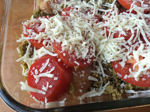 2. Spoon on and generously spread pre-made pesto on chicken.