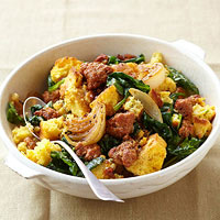2. In a large skillet cook sausage until brown. Drain fat, reserving 1 Tbsp. of drippings. Set sausage aside. In the same skillet cook onion in reserved drippings for 3 to 5 minutes or until starting to brown. Stir in spinach, fennel, salt, and pepper. In a large bowl combine cornbread pieces, sausage, and spinach mixture. Drizzle with broth to moisten, tossing lightly to combine. Spoon into a 2-quart round baking dish or casserole.