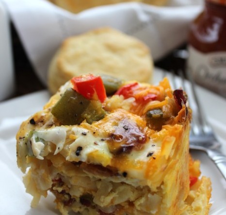 In the bottom of a slow cooker, layer: half of the hash browns and half of the following: onions, bacon, green and red peppers and cheese. Repeat layers with the remaining ingredients ending with cheese.