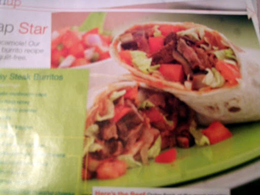 5. Spread 1/4 beans down a tortilla's center. Micrwave on high for 30 to 40 secnds; top with 1/2 cup steak mixture, 1/2 cup lettuce, 2 tablespoons taco sauce, 3 tablespoons tomato and 1 tablespoon cheese. Roll; prepare remaining burritos.