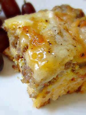 Cut biscuits into six to eight pieces place in a grease 8x8 pan, brown sausage on the stove top and drain spread over the cut up biscuits, beat eggs and add milk and salt and pepper to them and pour over sausage and biscuits, sprinkle both shredded cheeses over the top.