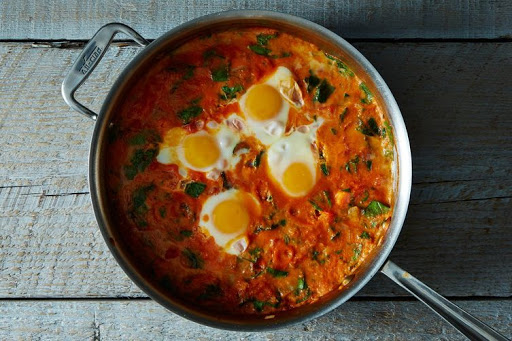 With a spoon, make four little pockets in the saucy mess into which you can crack the eggs. Crack them in, then sprinkle a little salt and pepper on each egg, and drag the whites through the sauce. Don’t break the yolk.