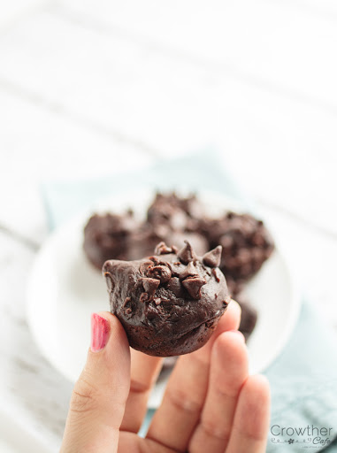 Grease a mini muffin pan and portion batter into 24 cups. I like to use a cookie scoop to do this. Top each muffin with several mini chocolate chips.