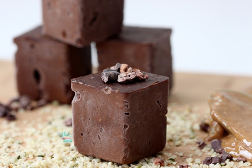 Place the dates/figs in a bowl and cover with water and soak for about an hour, until soft. Drain reserving liquid. In a food processor pulse together hemp seeds, cacao, protein powder, and maca if using until hemp seeds are ground down and you have a flour consistency. Pour mixture into a large bowl. In a Vitamix, or food processor, blend the dates/figs and vanilla until smooth, slowly adding soaking water as needed to form a creamy consistency. Add in nut butter or seed butter and blend until smooth. Pour into bowl with dry ingredients and stir with a spatula until combine. Divide mixture into silicone cube tray or press into a 8×8 or 9×9 pan lined with parchment paper. Tap pan or tray a few times to try to get out any air bubbles. Top with desired toppings if desired. Place in the freezer for 2-4 hours until firm. Cut into bars if made in a pan or remove from ice cube tray. Store in the freezer in an airtight container until ready to enjoy!