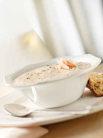 9. Reheat the soup to a gentle simmer, then ladle into serving bowls and top each with an equal amount of crab.